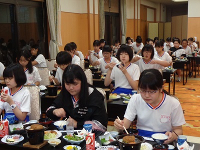 夕食も感染対策をしていただき、広い会場で同じ方向を向いて食べました。