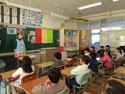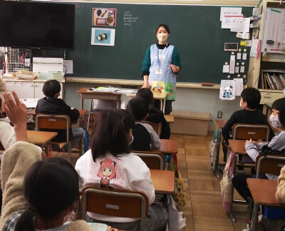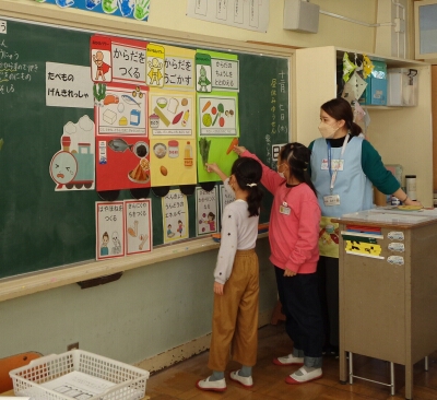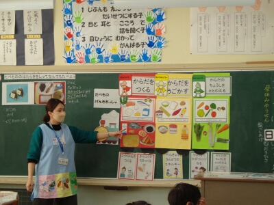 給食の献立を立てている学校栄養士さんと、食べ物の働きについての授業をしました。
