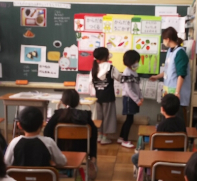 初めに、おにぎりと前日の給食(ひじきの煮物・魚・ご飯・牛乳)を比べて、たくさんの食品が使われている給食が、体に良さそうだと考えました。