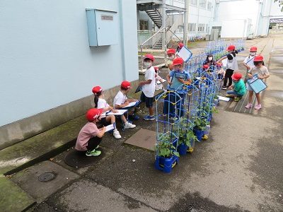 春に蒔いたアサガオに、1年生は毎日一生懸命水やりをしています。