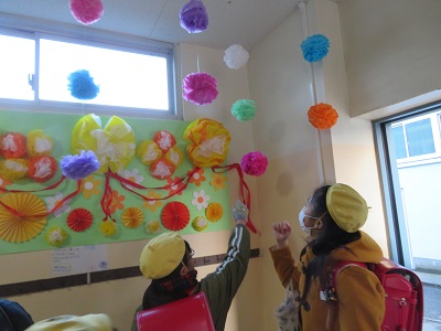 下校するときに飾りを見付けた6年生は、「わぁ~、すてき!」と歓声を上げていました。