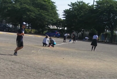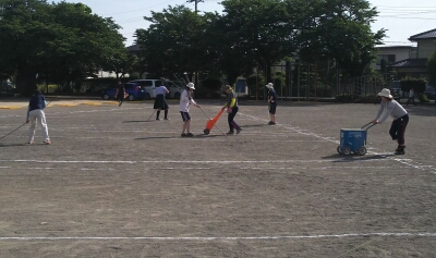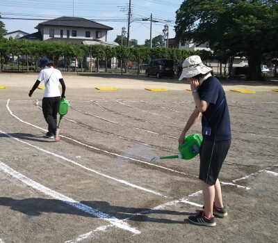 新体力テストを前に、職員作業で校庭にラインを引きました。