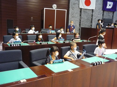 最後に、4階にある議場に入れていただき、議員さんの席に座らせていただきました。