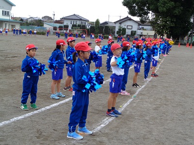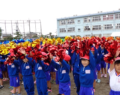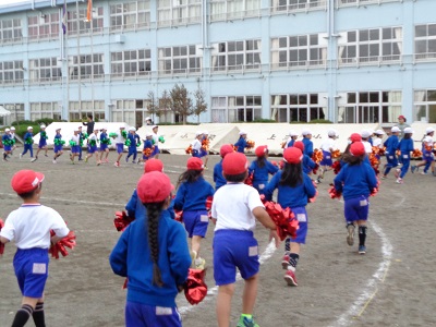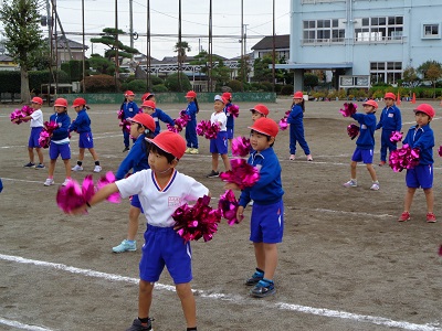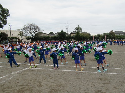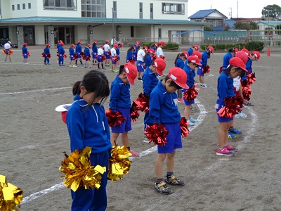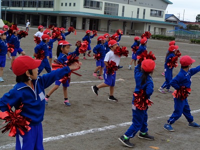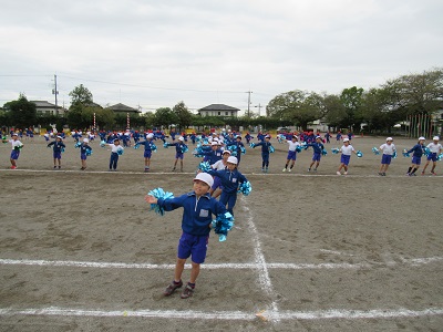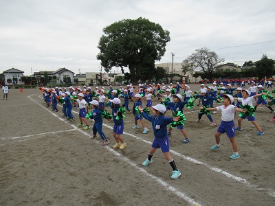 1、2年生が、ポンポンを持って本番さながらに練習をしました。