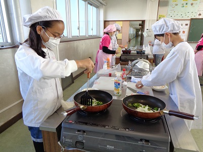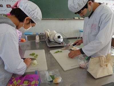 今回の調理実習では、主菜となるおかずを作りました。「ウインナーきんぴら」「はんぺんピザ」「豆腐とカニの炒め物」の中から一品選んで調理しました。