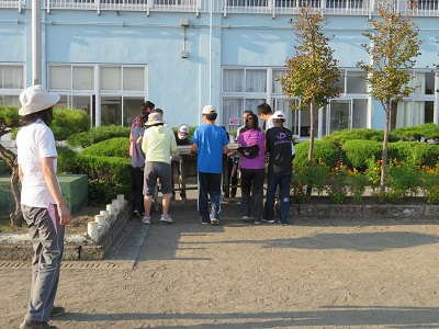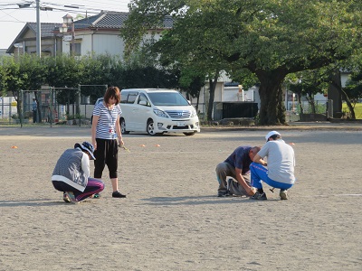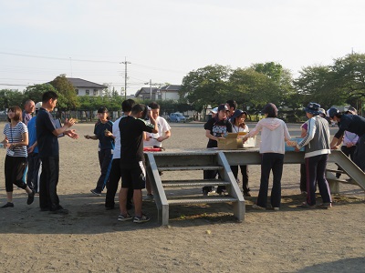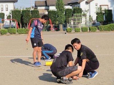 行進や演技の目安となるポイントを打ったり、緩んでいるロープを杭で止めたり、トラックの線を引き直したりと、職員みんなで協力して行いました。
