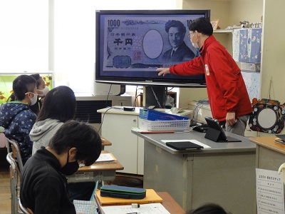 家庭科「生活を支えるお金と物」の学習で、金融広報アドバイザーが来校し、金銭教育の話をしてくださいました。