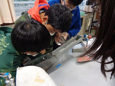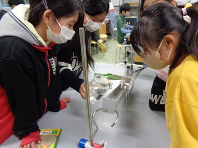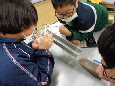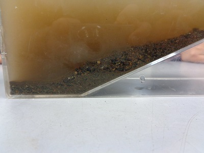 実験の結果から、粒が大きいほど下に沈み、小さい泥のようなものは長い時間漂っていることが分かりました。