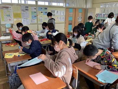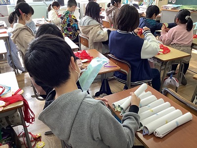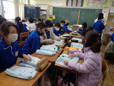5年生は、1,2,4年生が作ったカレンダー、3年生が作ったメダル、6年生が作ったカードと校長先生からの手紙を袋詰めします。