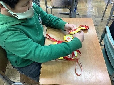 3年生が作ったメダルのリボンが絡まないよう、丁寧に巻いています。