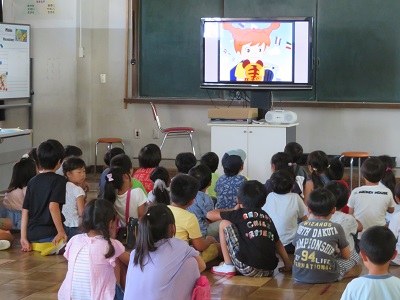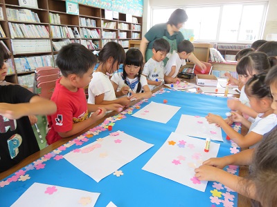 図書ボランティアの方が切ってくれた花を、青いラシャ紙の回りに貼っています。これは、入学式や卒業式の時の祝詞を貼る台紙です。新しくなった台紙を使うのは、卒業式の時です。