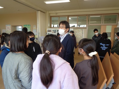 3組の様子です。調理室だったので座って話ができました。中学校の部活や勉強について真剣に話を聞いています。