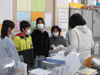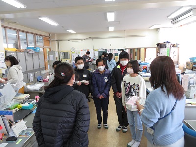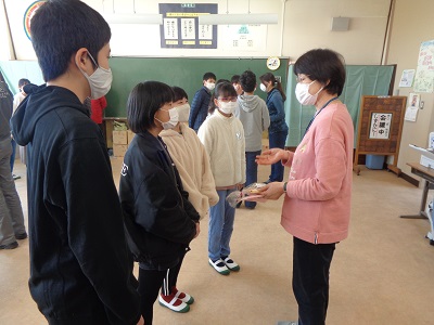 密にならないように、なかよし班ごとに別れて行いました。お世話になった先生方に、楽しひとときを過ごしていただくため、プレゼントを渡した後に、歓談の時間を設けました。接待するのはもちろん6年生です。相手に配慮しながら会話をすることも大人になる大切な第一歩ですね。