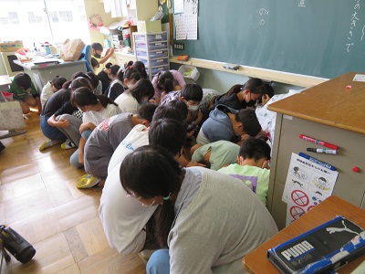 この間、他の教室の児童は、ドアの鍵を掛け、教室内で身をかがめて廊下から見えないようにします。