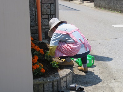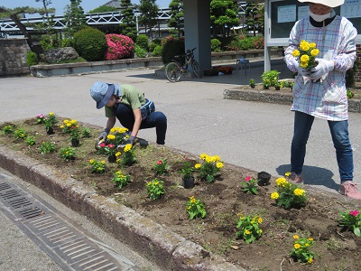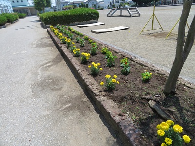 さわやか通りの花壇と西門の花壇に、マリーゴールドや日々草などを植えました。