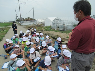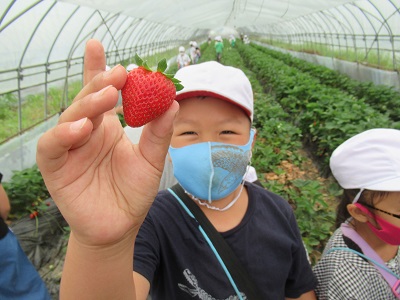 いちご農家の方への質問では,「どうしてハウスはビニールが2枚重ねなんですか。」や「いちごの周りのつぶつぶは何ですか。」などの素朴な疑問にも丁寧にお答えいただき,その度に「なるほど。」とうなずく子供の様子が見られました。