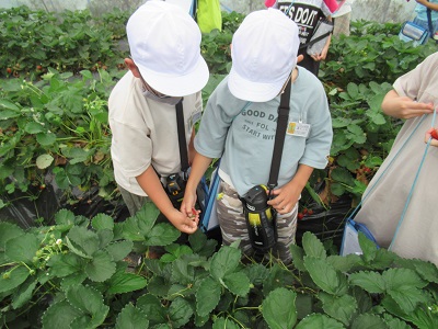 ハウスから甘い香りがしてきて,「いいにおい~!」と喜ぶ子供たち。いちごの葉や花,そして実をよく観察させてもらいました。