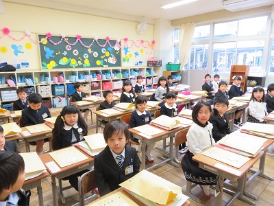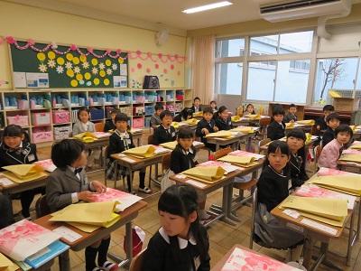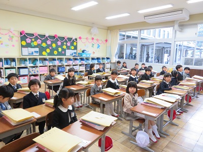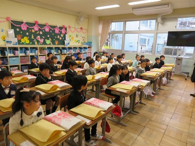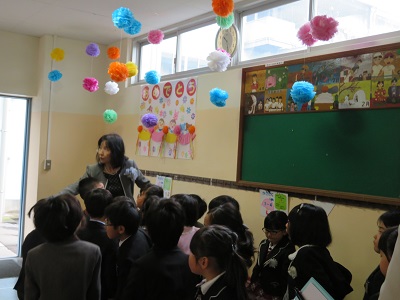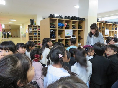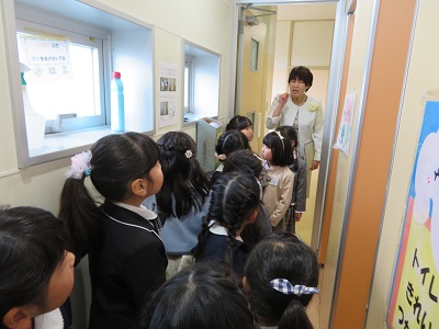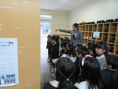 教室では、きちんと座ってお話を聞くことができました。お話が終わると、下駄箱や傘立て、水道、トイレの簡単な使い方の説明を聞きました。