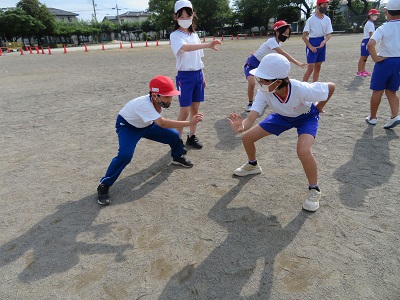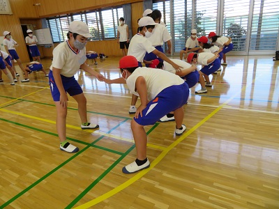 6年生が細かい動きをなかよし班の5年生に教えます。