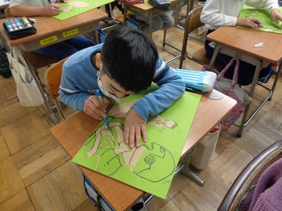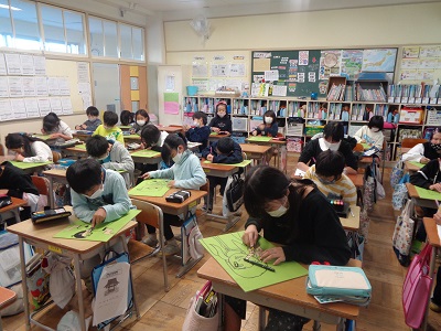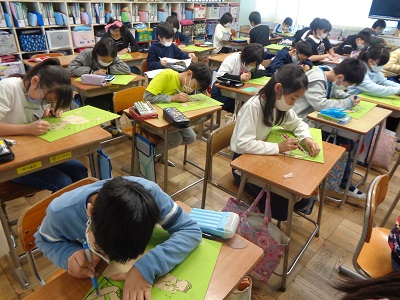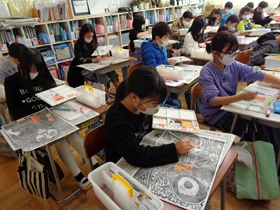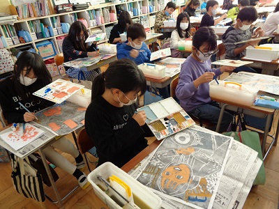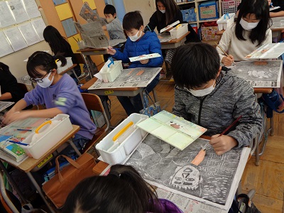 4年生は、彫刻刀を使って木版画に挑戦しています。