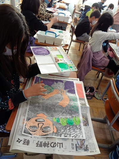 刷り終わると、絵の具で色を入れていきます。