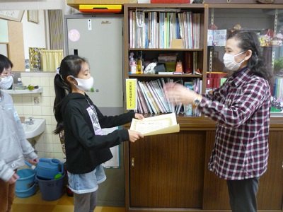 給食の時間に全校生に放送で紹介があり、昼休みに、校長室で表彰が行われました。