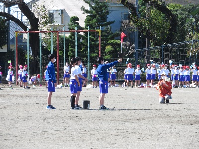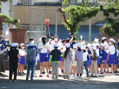 運動会当日も、朝礼台に聖火がともって、みんなの演技を見守っています。