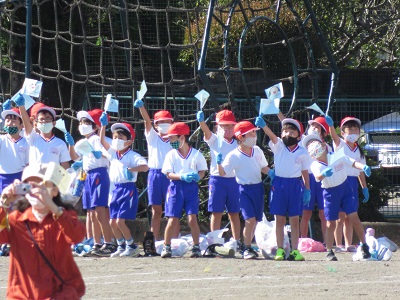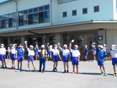 1年生も、旗を振って聖火ランナーが来るのを心待ちにしています。