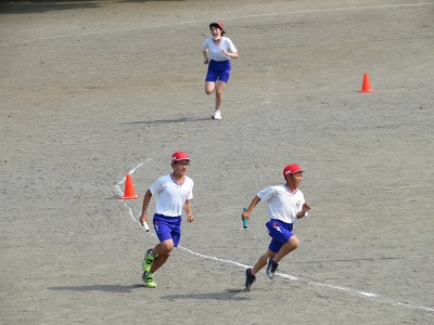 チームごとに分かれて、6年生を中心にバトンパスなどの練習をしました。