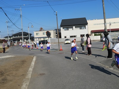 4年生は、校庭を1周してからロードに出ます。