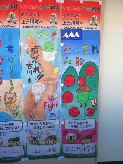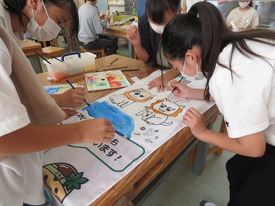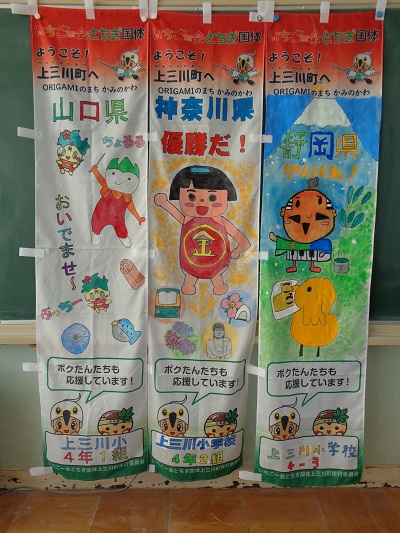 4~6年生の10クラスで、クラスごとに1つの県の応援のぼり旗に絵を描きました。