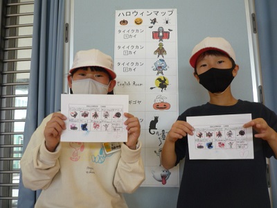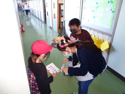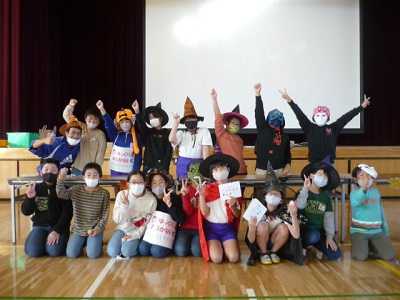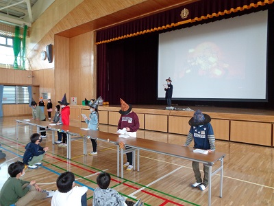 仮装した集会委員に「合言葉は?」と聞かれると,参加した子供たちは元気に「トリックオアトリート!」と答えていました。