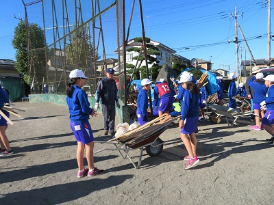 まずは、準備です。6年生が地域の方からいただいた材木を運びました。