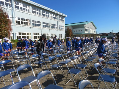5年生は、いすを400個、まっすぐにそろえて並べました。