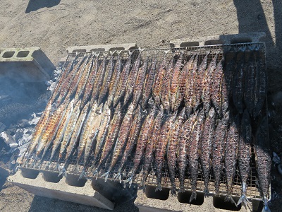 青空の下、おじいちゃん、おばあちゃんと一緒に、おいしいサンマと焼き芋をいただきました。