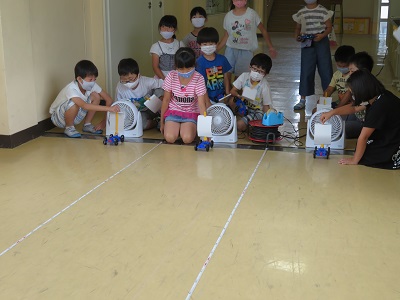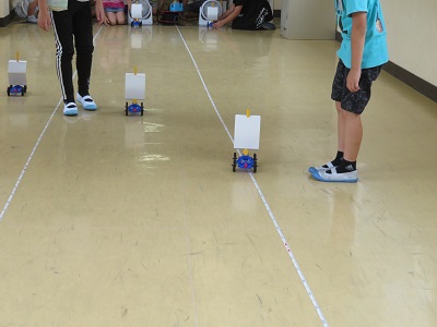 実験を通して、風受けが大きいとき、また、風が強いときに車が遠くまで走ることが分かりました。