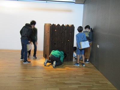 オブジェもたくさん展示されていました。穴から中をのぞくオブジェと段ボールでできたバイクが特に人気でした。