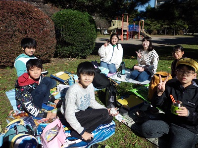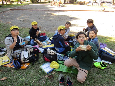 お昼は近くの公園で食べました。風が強かったのですが、子供たちはとても楽しそうにお弁当を食べていました。