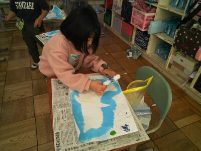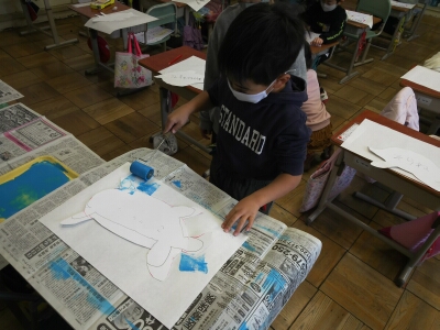 初めは、画用紙で作った型枠を、ローラーで塗りました。