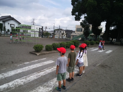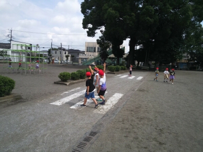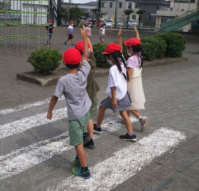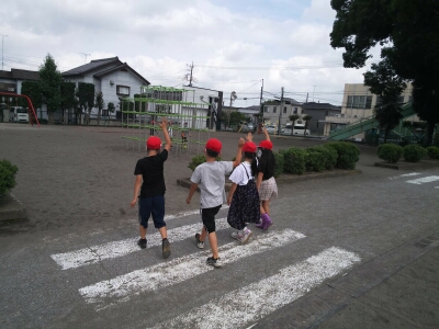 横断歩道を素早く渡るために、渡る前に横一列に並びなおすことや「右・左・右」と左右の確認をすること、手を大きく上げて渡ること練習しました。
