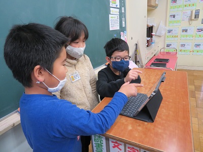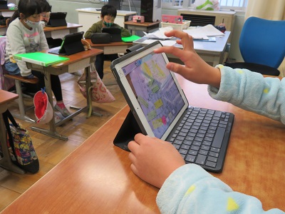 聞いている児童のところにも、発表者と同じ画面が出ています。