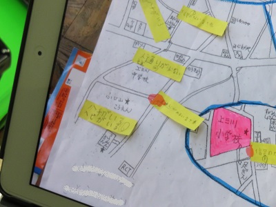 自分たちが登下校する道や、よく遊びに行く公園などで危険な場所を見付け、地図に付箋で印を付けました。
