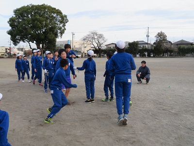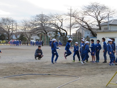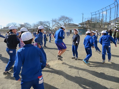1クラスを半分に分け、3分間で何回跳べるか、2チームの合計で競います。
