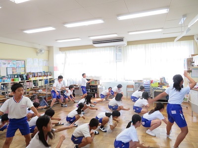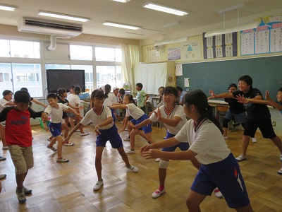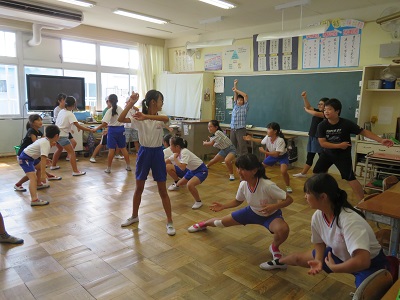 6年生が手本を示してまねをしたり、動きのポイントをアドバイスしたりしながら踊っていました。