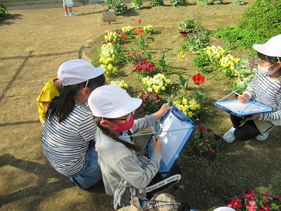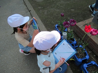 虫眼鏡を使って、ダンゴムシのヒダの様子や、チューリップのめしべやおしべの様子をよく見て、観察カードに記入していました。