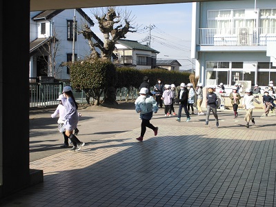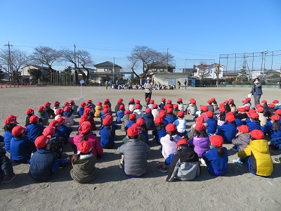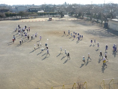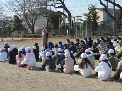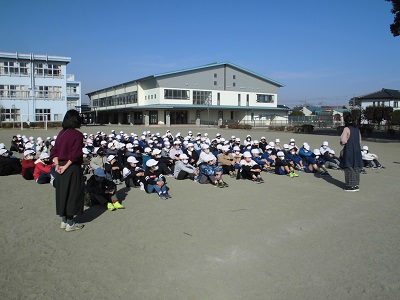 校庭南側が集合場所です。担任は学級の児童数を確認し、教頭先生に報告します。