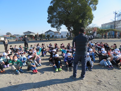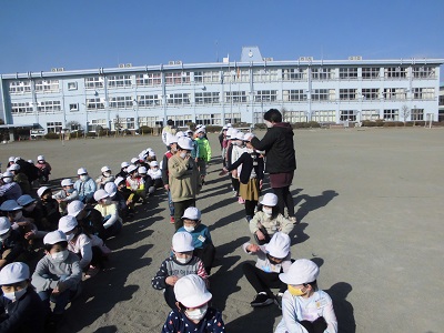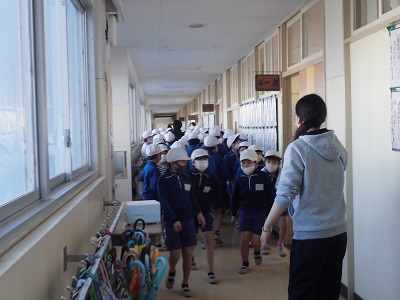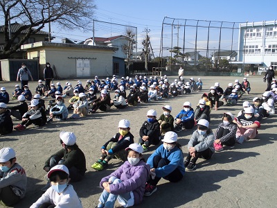 コロナ禍のため、業間と昼休みに学年を分けて避難訓練を行いました。