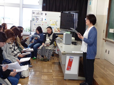 給食試食会の前に、栄養教諭から町の給食のシステムの話やマナーについての話がありました。