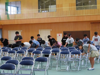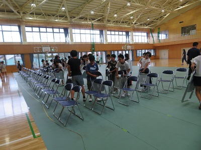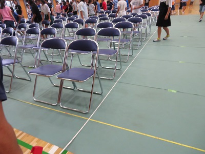 シートを敷いたり、椅子を並べたり、椅子の背もたれに番号を貼ったり・・・。
