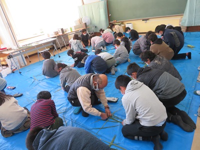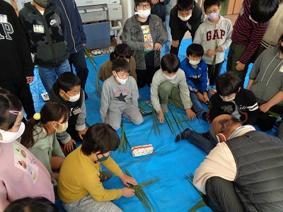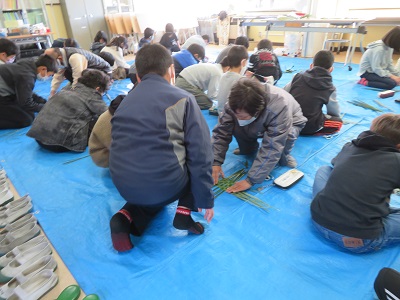 子供達は慣れない手つきで、一生懸命にシュロの葉を編んだり、結んだりしていました。